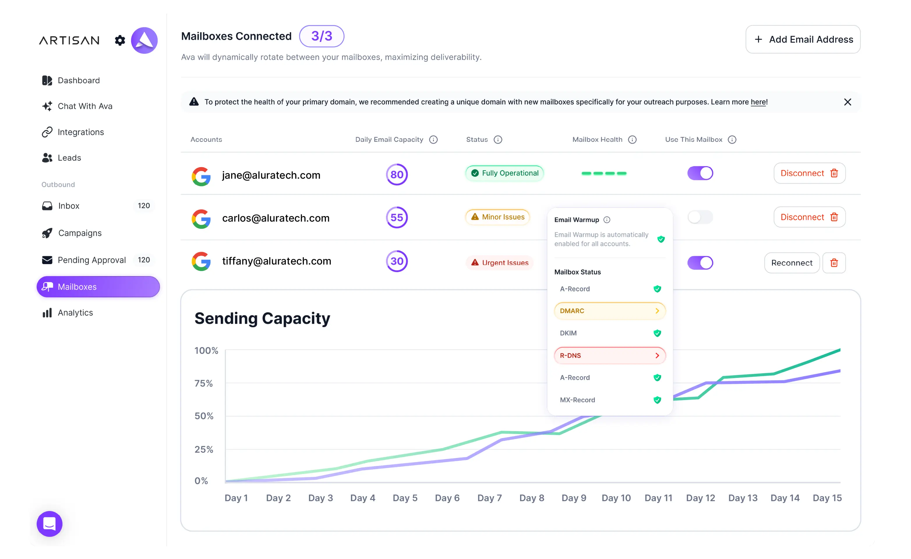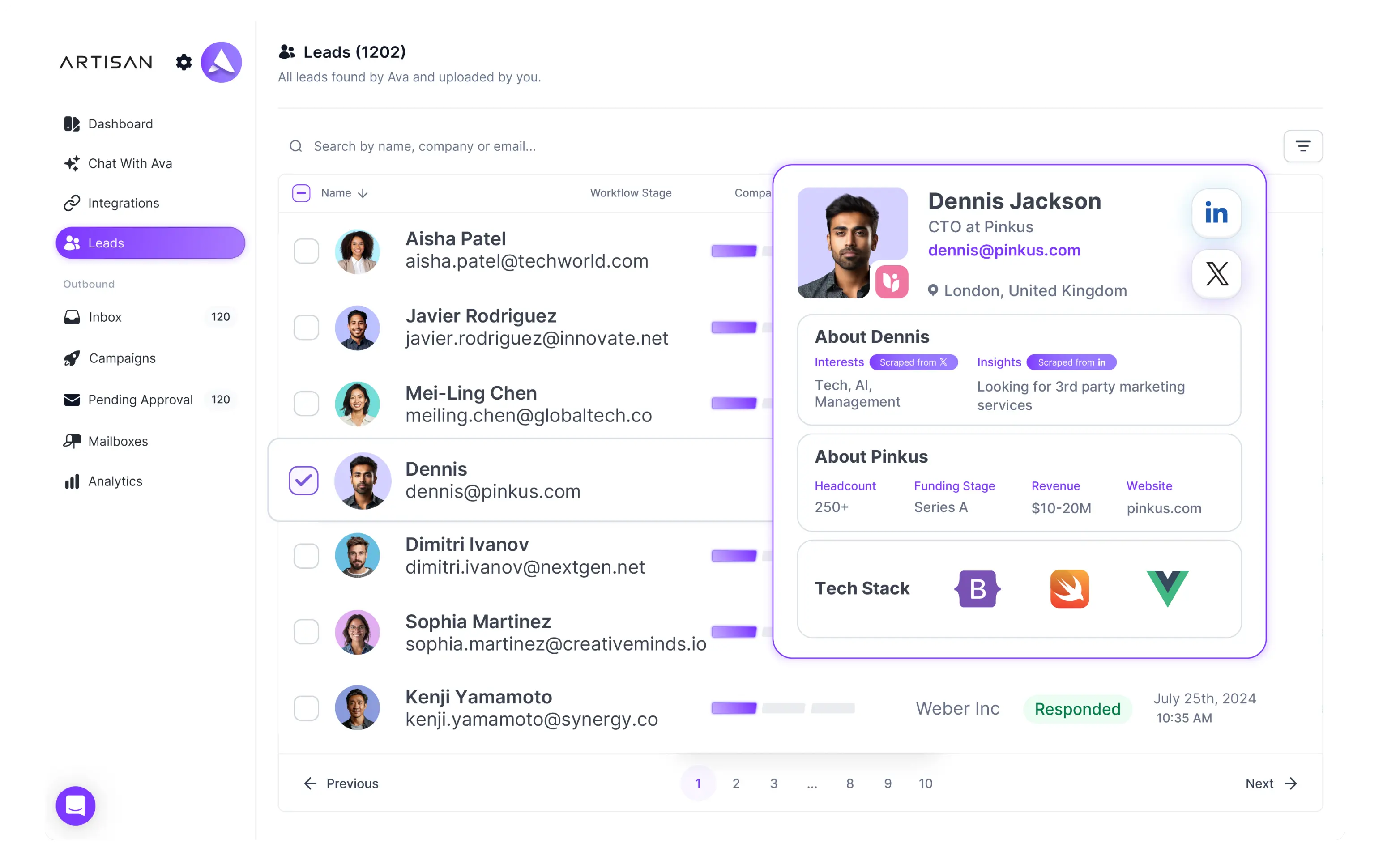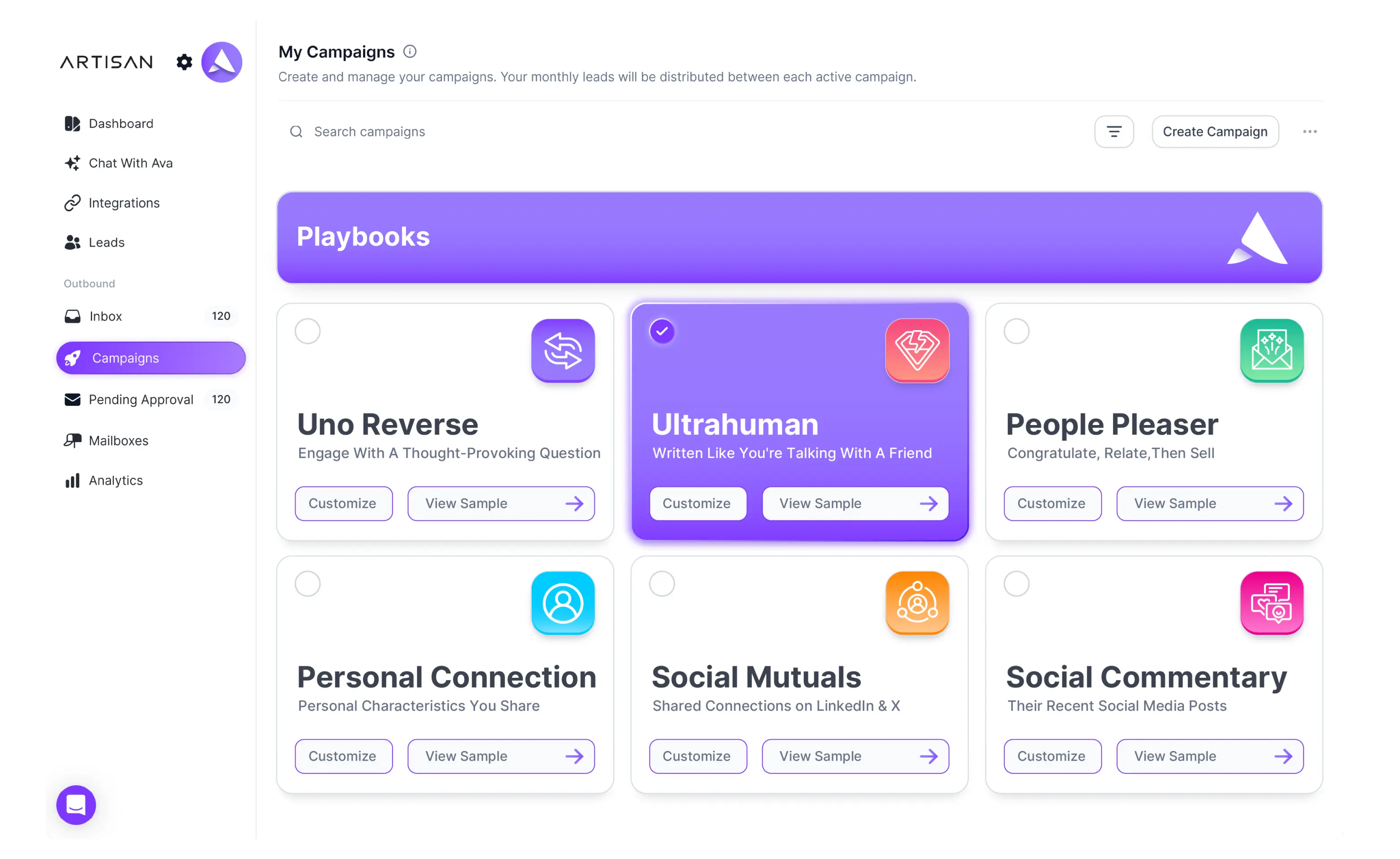 Launch and manage multiple outbound campaigns, each with their own audience, pitch & messaging.