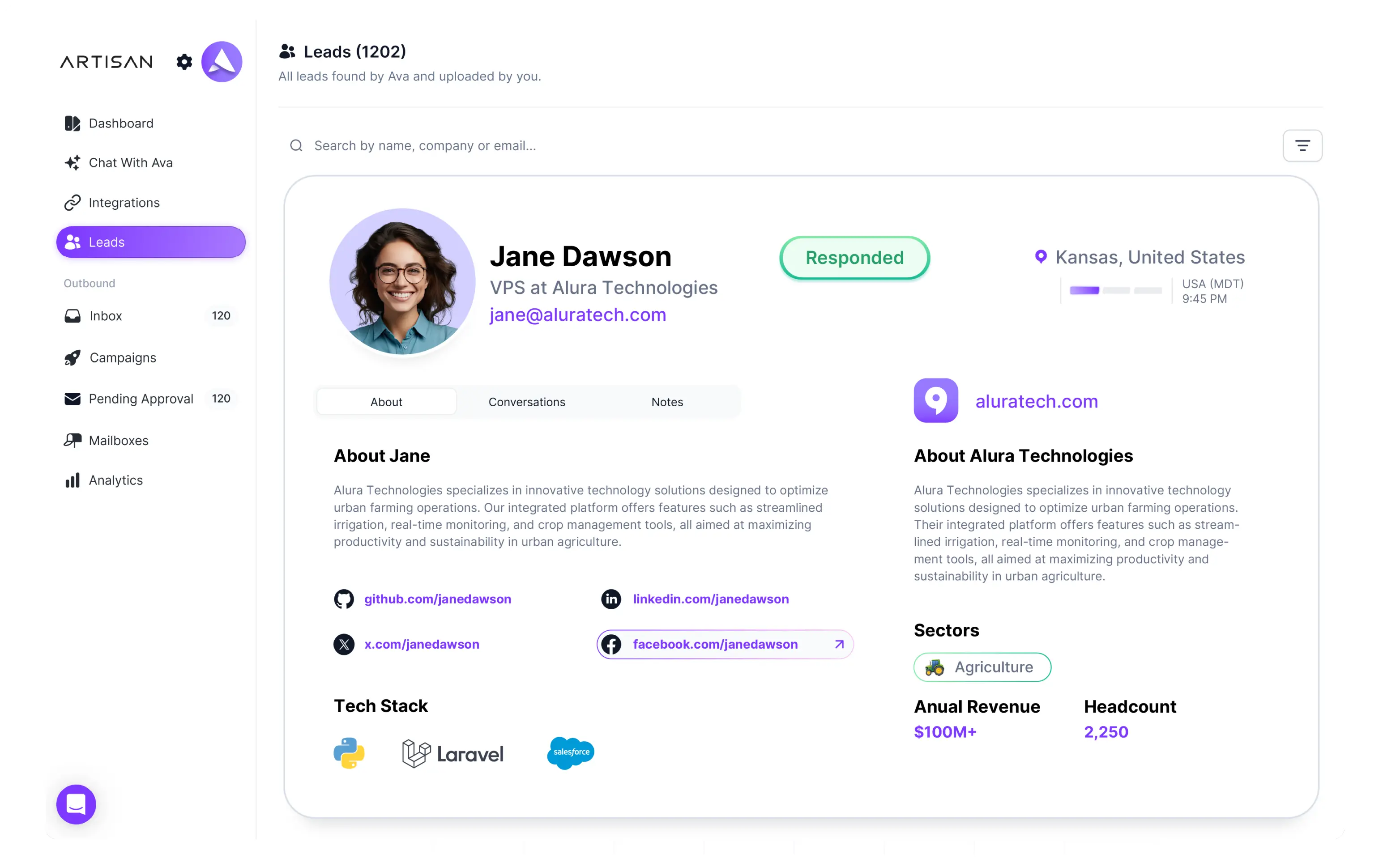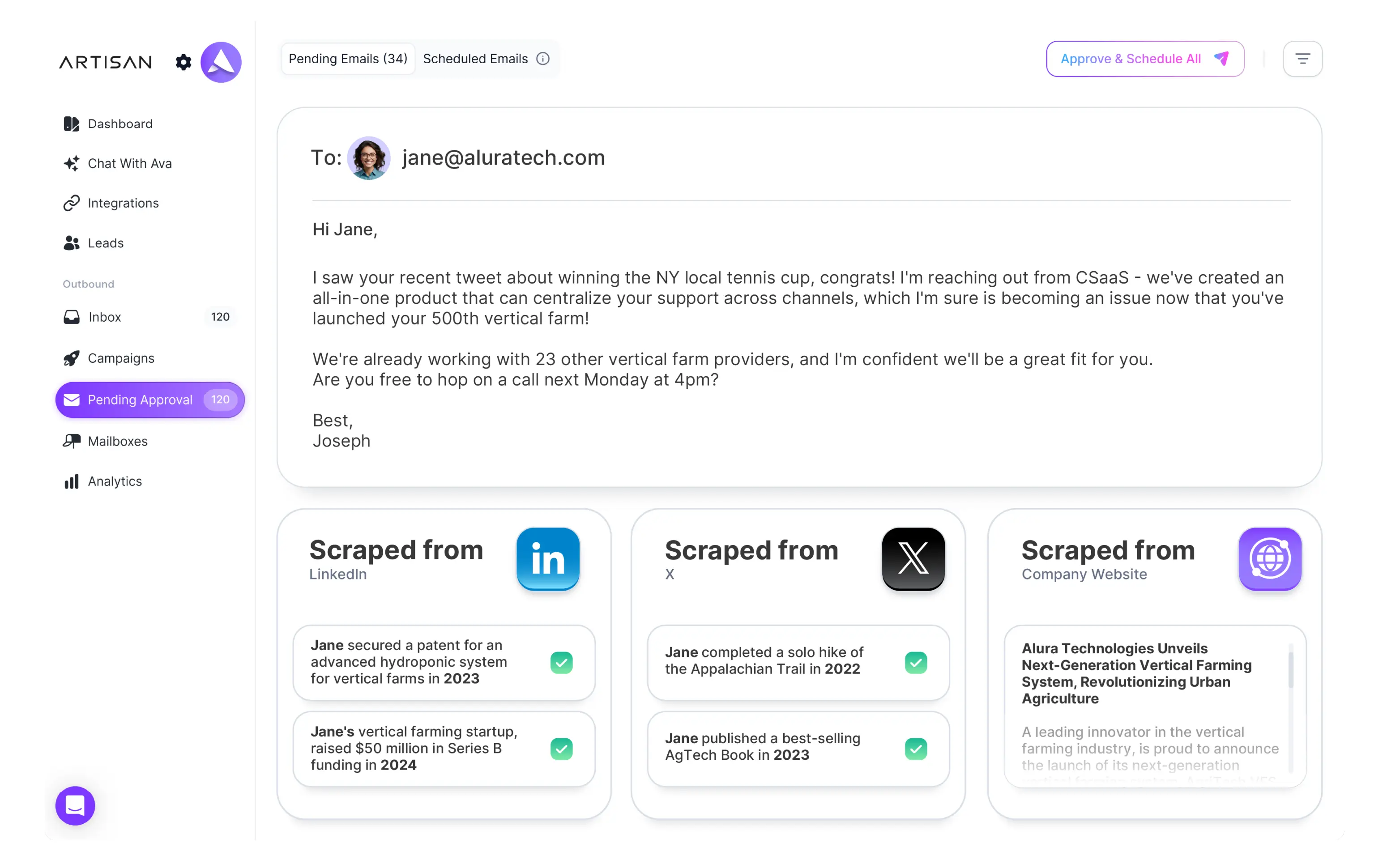 Using our Personalization Waterfall, Ava identifies the optimal personalization approach for each lead, drafting tailored emails and LinkedIn messages.